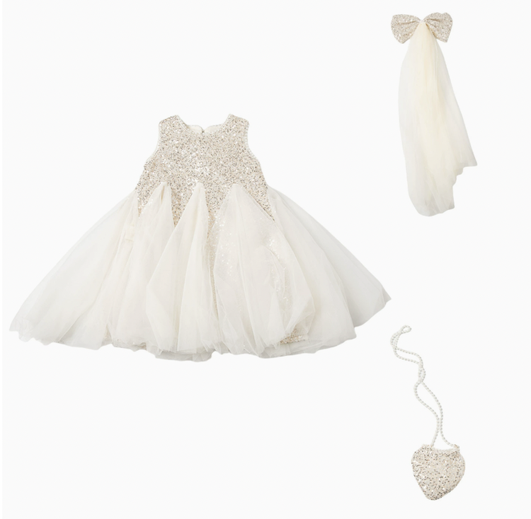 買洋裝就贈送同款蝴蝶結長紗髮飾品+愛心小包包