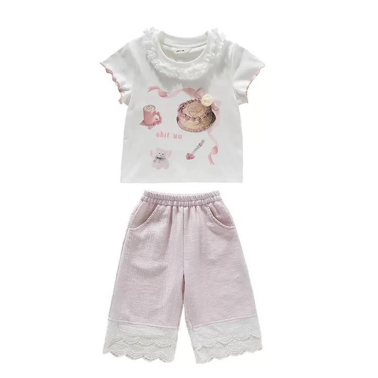 花邊甜點午茶上衣+薄款棉質拼蕾絲褲